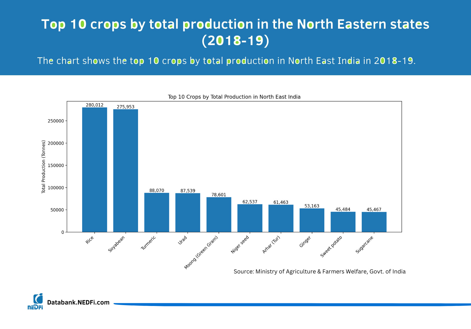 Top 10 crops by total production in the North Eastern states (2018-19)s (2018-19). Cereal Crops Coffee Plantation Fertilizer Foodgrains Horticulture Irrigation Jute & Mesta Land use Oilseeds Plantation Crops Pulses Rainfall Sugarcane Book traversal links for NE : Agriculture ‹ Water Up Cereal Crops ›